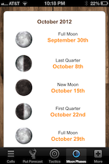If you are looking for location-specific solunar feeding periods, sunrise/sunset times, and moonrise/moonset times, please consider downloading our other app – iSolunar Hunting & Fishing Times. Based on John Alden Knight’s original Solunar Theory, deer are most active around a Full Moon or New Moon (4-star rating). This is when the gravitational forces of the sun and moon exert their strongest influence. Around the first and last quarter moons (1-star rating), the gravitational forces are the weakest and deer activity is less intense.